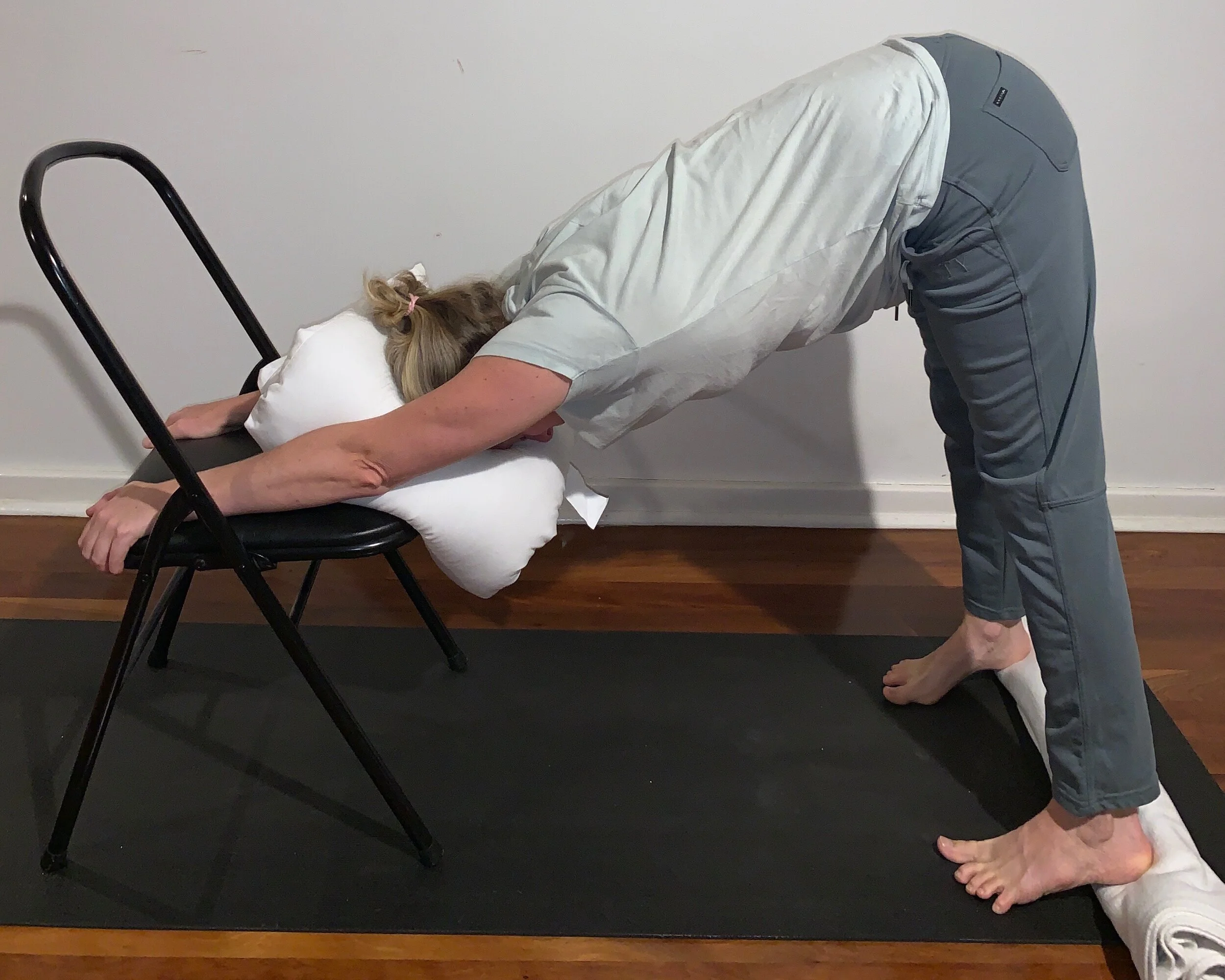For this pose, you’ll need to grab onto something sturdy such as a chair or a bedrail. You also need to be able to rest your head on something (e.g. a pillow). Put the chair against the wall or bed if it’s likely to slide